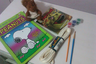 I chose the Young at Heart grab bag.  I received a Peanuts coloring book, a cute little squirrel, some paint and paint brushes, a book, and some paper twist.  Well, I have to say that once I opened the package, my girls screamed with joy and took the items from me!!  "Can we, can we" is all I heard.  So, instead of me getting to play with it, they did! It kept them entertained for a bit.  Even my 20 month old wanted in on the fun.